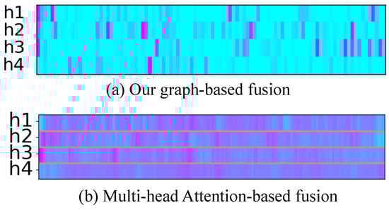 To further verify the effectiveness of the proposed model, we compared the output features of the graph fusion model with the output features of the attention mechanism fusion model (Figure 8d). The attention mechanism fusion model can only align some of the features fused, prioritizing features considered more informative. In contrast, the graph fusion model proposed in this paper shows its remarkable ability to capture overall feature alignment, providing a global feature representation by exploiting the connectivity patterns between nodes. This global perspective allows the graph network to be more comprehensive and in-depth when fusing features from different sources. Instead of considering each node in isolation, each node is evaluated in the context of the entire graph, enabling the model to capture subtle feature changes. Thus, the effectiveness of the model proposed in this paper is further validated.