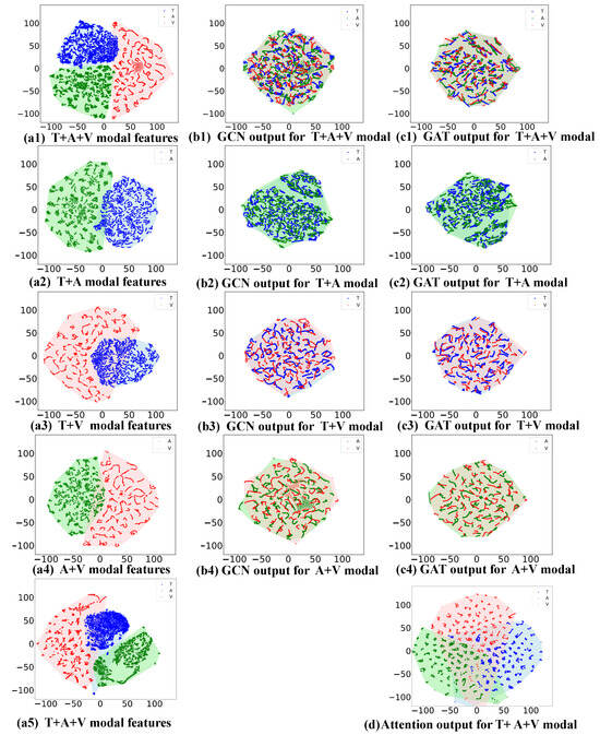 We employed t-SNE dimensionality reduction to visualize the hidden layer representations of the three parts of each model in the ablation experiments. The results are shown in Figure 8. The modal features after GRU processing are depicted in Figure 8a, which corresponds to the output C in the second part of Figure 2. The figures reveal discriminative clusters, with each color representing a modal feature. The blue dots represent textual features, green dots represent audio features, and red dots represent visual features. Figure 8(a1) shows the feature visualization of the three-modal model, where the dots of each color represent the hidden layer representations of the corresponding modal features after GRU processing. The t-SNE results indicate that these dots form distinctly separated clusters in the two-dimensional space, suggesting that the features of different modalities have distinguishable spatial representations after GRU processing. This distribution implies complementarity between the different modalities in the depression detection task, where each modality provides unique and distinguishable information. Figure 8(a2–a4) show visualizations of the three bimodal models. Notably, the audio and text modal internal features exhibit relatively concentrated clustering, whereas the text–video and audio–video modal features exhibit more dispersed clustering. This is because audio and text features are processed to maintain their original structural information, whereas video features are more decentralized due to their unstructured and complex nature. This difference is attributed to the fact that video data contains richer environmental information and dynamic changes, which are more difficult to retain during dimensionality reduction. Moreover, the video modal information is more diffusely distributed in each model, indicating that the video modality is not effective for depression prediction, consistent with the results in Table 5, where a single–video modal model has the worst performance.