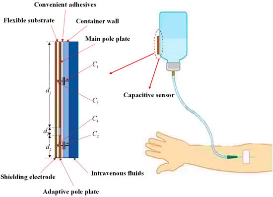 Intravenous infusion is an important clinical medical intervention, and its safety is critical to patient recovery. To mitigate the elevated risk of complications (e.g., air embolism) arising from delayed response to infusion endpoints, this paper designs a flexible double pole capacitive (FPB) sensor, which includes a main pole plate, an adaptive pole plate, and a back shielding electrode. The sensor establishes a mapping between residual liquid volume in the infusion bottle and its equivalent capacitance, enabling a non-contact adaptive monitoring system. The system enables precise quantification of residual liquid levels, suppressing baseline drift induced by environmental temperature/humidity fluctuations and container variations via an adaptive algorithm, without requiring manual calibration, and overcomes the limitations of traditional rigid sensors when adapting to curved containers. Experimental results showed that the system achieved an overall sensitivity of 753.5 , main pole plate linearity of 1.99%, and adaptive pole plate linearity of 0.53% across different test subjects, linearity of 0.53% across different test subjects, with liquid level resolution accuracy reaching 1 mm. These results validate the system’s ultra-high resolution (1 mm) and robust adaptability.