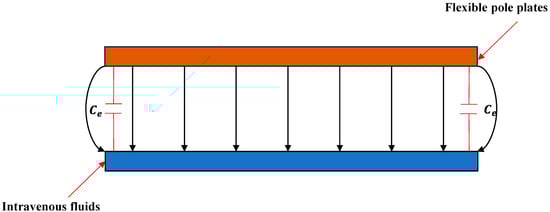 When the height of the intravenous fluid covering the sensor exceeds 26 mm, letanddenote consecutive capacitance measurements acquired by the main control circuit via Equation (8) for the adaptive pole plate, with corresponding liquid heightsand(>) covering the adaptive pole plate. From Equation (13),