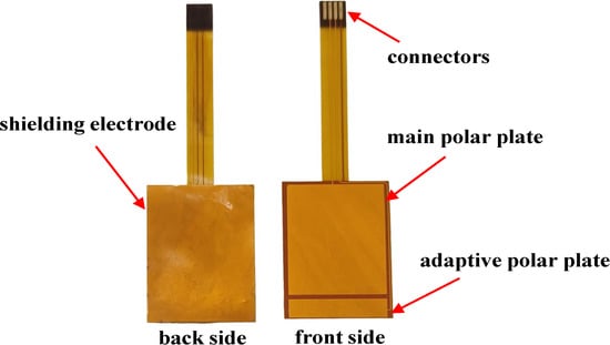 In summary, the main pole plate is designed as 24 mm × 20 mm, and the adaptive pole plate as 4 mm × 20 mm. A 20 mm × 30 mm rectangular shielding electrode is integrated on the back of the flexible substrate to isolate electromagnetic interference. Electrical connection between the sensor and main control board is achieved via a connector with an array of metal pins (4 mm length, 1 mm width, 1 mm pitch). The back of the pole plates is reinforced with PI to enhance mechanical strength, while 3M double-sided tape ensures firm adhesion to the bottle. Sensor prototypes, fabricated by JLCPCB (Shenzhen, China) and shown in Figure 3, utilize a mature FPC manufacturing process suitable for mass production with competitive costs.