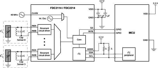 The FDC2214, a four-channel high-precision capacitance digitizer from Texas Instruments (TI, Dallas, TX, USA), is designed for non-contact sensing in complex environments. Based on LC resonance principles, it converts capacitance variations induced by the target into digital outputs. With 28-bit resolution, support for four-channel multi-node monitoring, and a maximum sampling rate of 13.3 ksps, its innovative anti-jamming design integrates differential sensing and electromagnetic shielding to suppress ambient noise, ensuring stable performance under temperature fluctuations, humidity changes, or pollutant exposure. The simplified circuit of the FDC2214 (from its datasheet) is shown in Figure 4.