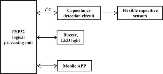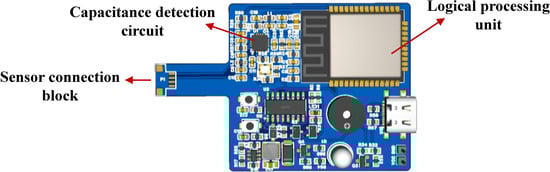 Thus, the analog capacitance from the sensor is digitized by the FDC2214, and the coupling capacitance with the intravenous fluid is derived via Equation (8). The hardware design block diagram and main control board are shown in Figure 5 and Figure 6, respectively.