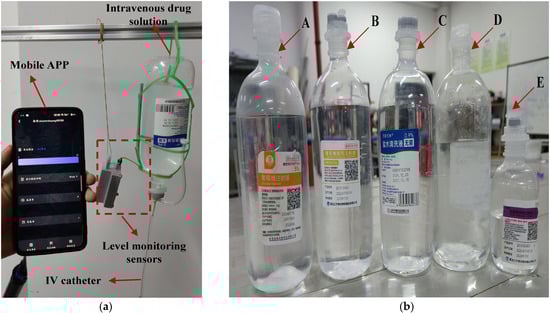 The experimental test scenario and the intravenous drug solutions used in the experiment. In (a), shows the test scenario for this sensor. In (b), A, B, C, D, and E represent five commonly used intravenous solutions: 5% glucose injection, compound sodium chloride injection, calcium gluconate injection, 0.9% sodium chloride saline, and sodium lactate Ringer’s injection.