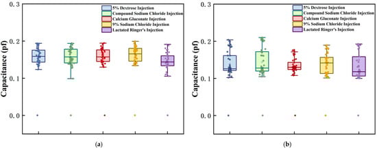 Initial capacitance test results for each intravenous drug solution. Graphs (a,b), respectively, represent the measurement results of the main pole plate and the adaptive pole plate when facing different experimental subjects.