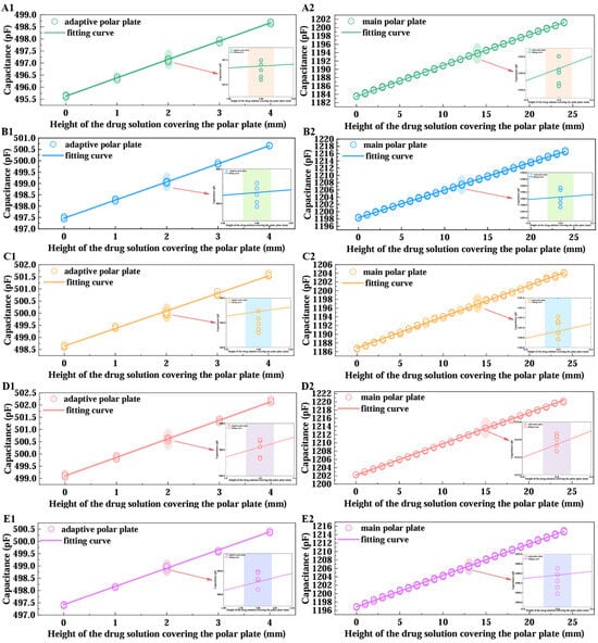 Plot of fitted curves for intravenous drug solution data. (A–E) represent sodium lactate Ringer injection, 5% dextrose injection, compound sodium chloride injection, 0.9% sodium chloride saline, and calcium gluconate injection as the experimental objects, respectively. “1” denotes the test results when the drug solution covers the adaptive pole plate, and “2” denotes the results when it covers the main pole plate.