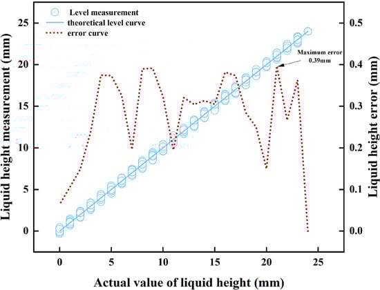 The aforementioned data comprehensively reveal the sensor’s dynamic monitoring performance: in intravenous infusion scenarios, as the main pole plate has a length of 24 mm, the maximum height measurement error introduced by the main pole plate’s overall linearity () is less than 0.5 mm, which is far below the error range specified by clinical alarm thresholds—typically requiring alarms to trigger when residual liquid height is within 10 mm, with allowable error less than 1 mm. This enables near-instantaneous warning activation, ensuring infusion safety. Meanwhile, as the adaptive pole plate has a length of 4 mm, the measurement error (less than 0.05 mm) induced by its excellent overall linearity () is negligible relative to the system’s 1 mm resolution, effectively mitigating interference from dynamic liquid surfaces on monitoring accuracy. Additionally, the maximum relative error in slope fitting between the two electrodes across five parallel experiments was only 0.66%, further validating the equivalence of their characteristics and strong consistency with the theoretical model. In summary, the sensor’s mathematical model has been experimentally validated, supporting the application of Equation (17) for precise measurement of residual intravenous drug height (dynamic monitoring results for the main pole plate coverage height are presented in Figure 10).