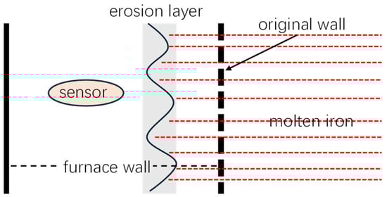 Blast furnaces are large-scale degrading complex systems, and their degradation is caused by the erosion of molten iron. Due to the high cost of blast furnace downtime and the difficulty of directly measuring the furnace wall thickness, temperature sensors are commonly used in industrial practice to monitor the degree of wall degradation. In engineering practice, sensors are strategically placed at a suitable depth within the furnace wall to ensure safety [,]. A temperature reading that approaches that of molten iron (approx. 1400 °C) is a clear indicator that erosion has progressed to at least the sensor’s depth. Figure 1 illustrates the degradation process of the furnace wall. Consequently, once the temperature surpasses a predetermined threshold, the furnace must be taken offline for a major overhaul. Since this overhaul requires the complete reconstruction of the wall, it defines the end of the blast furnace’s lifespan.