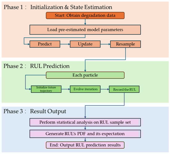 In this section, we further introduce how to obtain the RUL of the proposed degradation model. As discussed in many research studies, it is hard to derive the analytical solution of the lifetime subject to the proposed jump diffusion degradation process model. Therefore, we provide a Monte Carlo approach to derive the RUL under the concept of the FPT. Figure 3 illustrates the flowchart of the particle filter estimation method proposed in this Section.