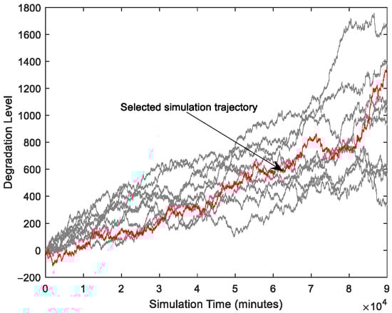 In fact, owing to the complexity and uncertainty of the systems and their operating environment, the data directly observed from many industrial systems often cannot be obtained. A common way is to measure some given intermediate performance indicators, just like the temperature sensors for the thickness of the furnace wall [,,,,,,,,]. As such, some outstanding random jumps exist in the degradation process. In addition, with the deepening of the systems’ deterioration, the stability of the systems becomes gradually worse, which makes the systems more vulnerable to random shock. It should be noted that if we ignore these random jumps, the degradation model is not suitable, which must affect the accuracy of the lifetime or RUL estimation []. In this paper, we mainly concentrate on degrading systems with random jumps.