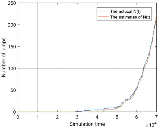 Moreover, we further estimate the number of the jumps, i.e., N(t) in Equation (23) based on particle filtering. Figure 6 shows the comparison between the actual value and its estimates.