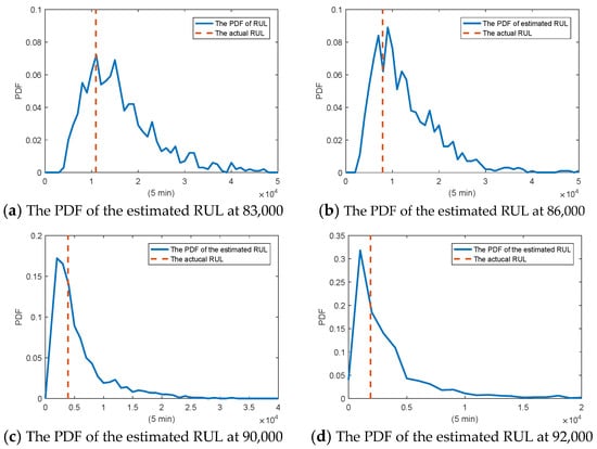 From Table 3, it is noteworthy that is much larger than , which can illustrate the existence of the random jumps. Then, combing the estimates of the parameters, we can predict the RUL based on the particle filtering method. Figure 7 shows the estimate of RUL at different testing times. Empirical tests on an Intel Core i9-13900H processor produced by Intel Corporation, Santa Clara, CA, USA. show that with 200 particles, the prediction time is 168 s, which is well below the 5-min sampling interval. This demonstrates the method’s feasibility for real-time industrial applications. It is important to note, however, that this prediction is performed on a large-scale dataset within a two-dimensional state–space. Therefore, while the prediction time is acceptable, it is still relatively slow. Future work could focus on reducing the number of particles to further decrease the computation time.