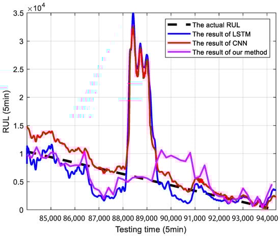 Figure 8 compares the results of our proposed method with those of the CNN and LSTM methods. Table 4 presents the quantitative metrics of our proposed method for RUL prediction, in comparison with the CNN and LSTM methods.