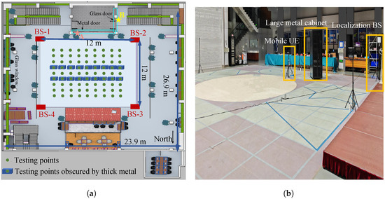 The measurement scenario is a large testing hall with dimensions 23.9 m × 26.9 m × 8 m, as shown in Figure 1. The testing hall contains concrete walls, glass doors and windows, wooden furniture, and large metal equipment, among other materials. The selected testing area is a square field with dimensions 12 m × 12 m. Four localization BSs with antenna heights of 1.66 m are placed at the four corners of the testing area. The height of the UE antenna is 1.24 m. The spacing of the 81 testing locations along the UE movement trajectory is 1 m. In order to create both LOS and NLOS propagation conditions for the experiment, a movable metal cabinet with dimensions 1.3 m × 1 m × 2.5 m is used as a physical barrier to form about 23% NLOS propagation conditions. Specifically, the number of locations occluded by the metal cabinet is 18, and the metal cabinet is moved to block the LOS path between the UE and the localization BS when the UE is moving. In the measurement experiments, the moving speed of the UE is 1 m/s, and the positioning frequency of the UE is set to 1 Hz. These values were chosen specifically for automated testing.