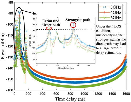First, the direct path needs to be identified. In general, under the line-of-sight (LOS) scenario, the strongest path between the transmitter and the receiver can be identified as the direct path. However, direct-path delay estimation errors become significant when identifying the strongest path as the direct path under the NLOS scenario, where the LOS path between the UE and the BS is obstructed by physical barriers. To mitigate this issue, the earliest arrival path can be tentatively identified as the direct path within a wider frequency band by changing the channels. The reason is that multipath signals operating at different frequencies suffer varying levels of propagation attenuation. The formula can be written as