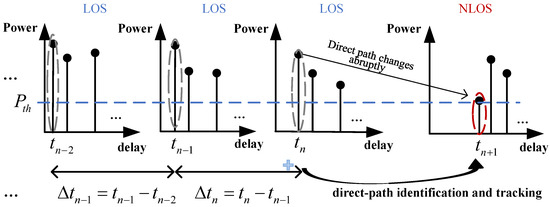 As shown in Figure 3, direct-path tracking is described as the direct path under the identified NLOS propagation condition at the present localization moment can be predicted based on the LOS propagation conditions at its previous n localization moments. The value of n is typically kept small (usually fewer than 10 localization moments). This is primarily due to two critical considerations: first, to avoid accumulating errors during the direct-path tracking process, and second, to reduce system complexity. Considering the worst case where few LOS conditions are available in the scenario, the tracked direct path at this localization moment in the NLOS can serve as prior information for tracking the direct path under the NLOS scenario later.