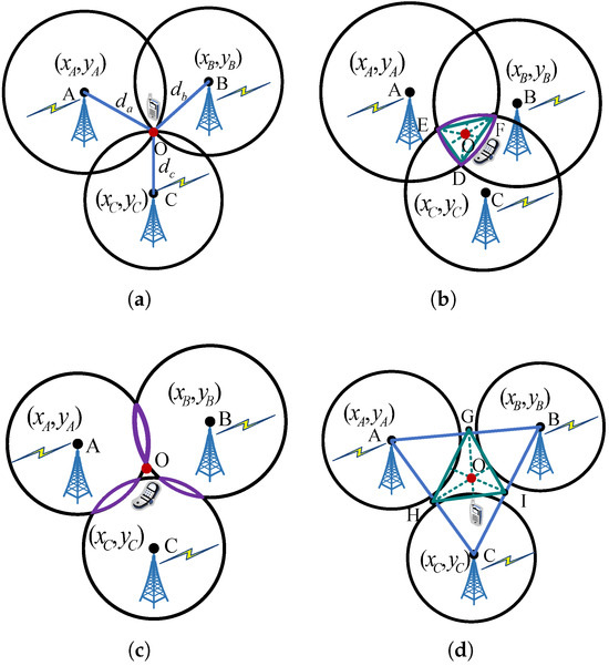 Ideally, when the estimated ranges of the three BSs are error-free, the three circles intersect at a single point, as illustrated in Figure 4a. In this case, the estimated UE coordinates can be determined based on trilateration [7], which can be formulated as