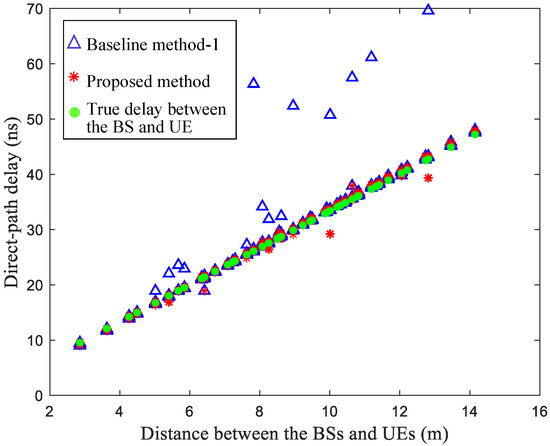 Figure 7 compares the results of the estimated direct-path delays between the localization BSs and the UEs when using the baseline method-1 and the proposed method. The direct-path delay under the identified NLOS scenario would be effectively tracked using the proposed method, where the estimated direct-path delay is closer to the true delay along the UE movement trajectory. When using the proposed method, the mean absolute error of the estimated direct-path delay along the UE movement trajectory is about 1.17 ns. However, the baseline method-1 does not track the direct path under the NLOS scenario. When using the baseline method-1, the mean absolute error of the estimated direct-path delay along the UE movement trajectory is about 3.16 ns. A larger delay error generally leads to a larger range error and localization error.