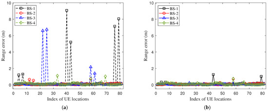 Comparison of range errors at different testing locations under 23% NLOS propagation conditions along the UE trajectory: (a) Range error when using the baseline method-1. (b) Range error when using the proposed method.