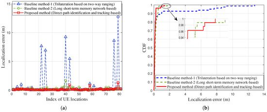 Comparison of localization error when using the baseline methods and the proposed method under 23% NLOS propagation conditions along the UE trajectory: (a) Localization errors at different testing locations. (b) The CDF of localization errors.