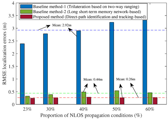 In addition, to further demonstrate the robustness of the proposed method under different testing conditions, we also compared the results of different numbers of BSs and different proportions of NLOS propagation conditions, as shown in Figure 11 and Figure 12. In Figure 11, each index corresponds to a different number of BSs in various cases. For example, Index 1 (3 BSs, No BS-1) means that there are 3 BSs with BS-1 removed in the testing hall scenario of Figure 1. The results in Figure 11 indicate that the proposed method consistently outperforms the baseline methods in all cases even with fewer BSs. The averages of the RMSE localization errors for the two baseline methods are approximately 2.19 m and 0.4 m, respectively. For the proposed method, the average RMSE localization error is about 0.23 m. Notably, in the case with three BSs (with BS-1 removed), the average RMSE localization error is slightly lower than the case with four BSs, potentially due to the fact that BS-1 was located near glass window walls on the east and south sides. In the scenario shown in Figure 12, the averages of the RMSE localization errors for the two baseline methods are approximately 2.92 m and 0.44 m, respectively. For the proposed method, the average RMSE localization error is about 0.26 m. It can be seen that our method consistently and significantly outperformed both comparison methods across all the cases of different proportions of NLOS propagation conditions, even under 60% NLOS propagation conditions along the UE trajectory.