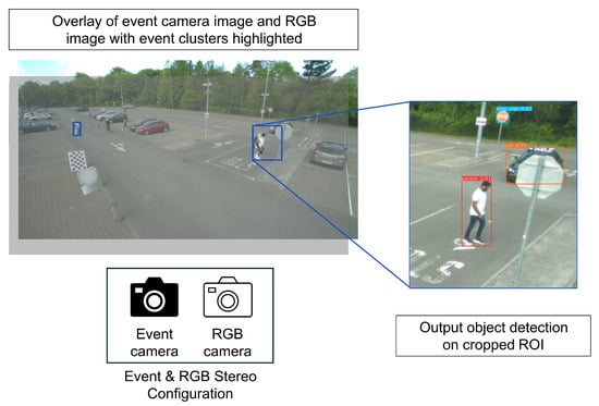Proof-of-concept system design. The camera rig is shown with the event camera and the RGB camera side by side. This records the data of the scene in the foreground. The images from each camera are overlayed to highlight the different image planes of the cameras. The bounding boxes of the detected events, and the output object detection results that are run on the cropped ROIs of the RGB image are shown to demonstrate the steps used in the design.