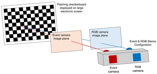 An improvement on this manual calibration is implemented in the DSEC dataset [22], which combines two 640 × 480 resolution event cameras and two 1440 × 1080 resolution RGB cameras with LIDAR and GPS sensors. Event camera calibration is completed using the E2VID algorithm by Rebecq et al. [7], available at https://github.com/uzh-rpg/rpg_e2vid (accessed on 9 July 2025) to reconstruct grayscale images of a checkerboard pattern being moved in front of the camera, which can be used in common calibration frameworks. GPS is used for time synchronization between images, which are then used to calibrate the cameras with the Kalibr toolbox [23] to estimate extrinsic parameters.