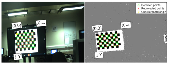The Matlab Stereo Camera Calibration application was used to calibrate the two cameras. The RGB images were resized to match the resolution and aspect ratio of the event camera. Corresponding images from the event camera and the RGB camera were analyzed by the Matlab stereo calibration application. The camera parameters were estimated using the algorithm proposed by Zhang in [21] to give the projection results shown in Figure 4. Furthermore, the relative positioning between both cameras remained constant. They were mounted on aluminum extrusion, ensuring that their relative positions did not change between calibration and data capture. The impacts of temperature variations and mechanical vibrations were negligible.