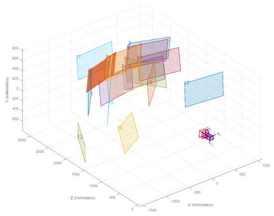 Figure 5 shows the camera-centric diagram generated by the Matlab R2023a Stereo Calibration tool. It shows the stereo camera pair and its real-world position relative to each of the checkerboard images used in the process. The overall mean error achieved for seventeen images was 0.24 pixels, with a range of [0.09, 0.42]. In general, a mean error of <1 pixel is acceptable; therefore, all images meet this requirement and can be included in the calibration.