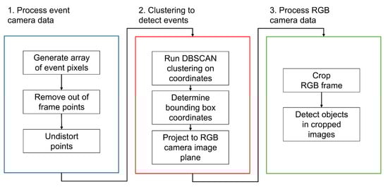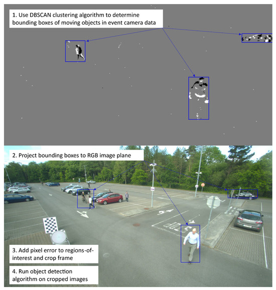 When motion is detected by the event camera, a clustering algorithm is run on the resulting data to determine the bounding boxes of the event in the event camera image plane. These bounding box coordinates are then projected to their corresponding pixel coordinates in the RGB camera image plane, determining the high-accuracy foveal areas of the image. The RGB frame is then cropped to the area of the image determined by these bounding boxes, and object detection is run on these cropped images.