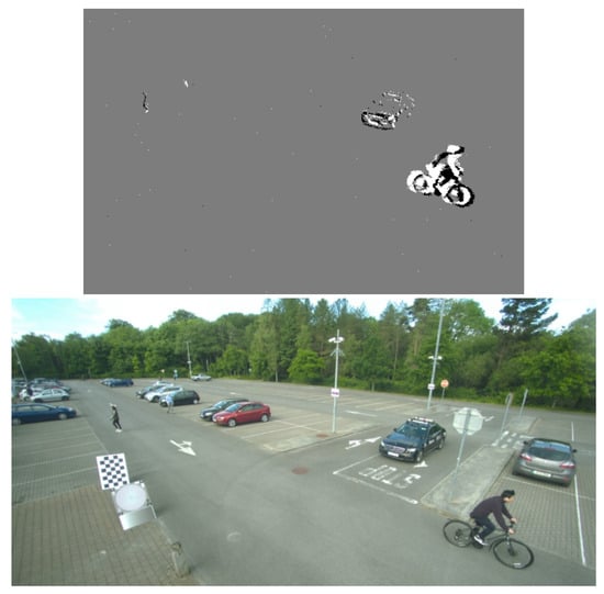 Figure A5 highlights some of the limitations of the system. There are five moving objects in the image: three people, a rider, and a car. Due to the location of the objects in the frame, the clustering algorithm groups the car into the same cluster as a person, and the rider into the same cluster as another person. The person on the left side of the frame is quite far away from the cameras; therefore, only a few event pixels are detected by the sensor, and the resulting bounding box is very small. The classifier is trained to detect one object per image; therefore, for each image, the prediction with the highest confidence is taken as the result. The model correctly classifies the person in the right region, and the rider in the middle region; however, due to both regions containing two objects, the second object is missed by the model. With the addition of the pixel error before cropping, the person in the left region is correctly identified by the model; however, the accuracy of the bounding box prediction is low. This is due to the limitations of the event camera at that distance, and the accuracy of the projection.