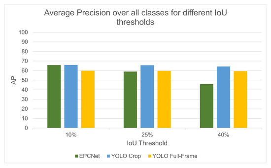 To better understand the system’s behavior under these conditions, we report additional performance metrics at lower IoU thresholds (AP10, AP25, and AP40). These thresholds help to evaluate the classifier’s ability to correctly identify object classes in approximately correct regions, even when bounding box alignment is imperfect. For instance, EPCNet achieves >70% AP at IoU = 10% for the car class, which reflects strong semantic localization despite geometric inaccuracies. We recognize that these non-standard metrics are less common in benchmarking but are useful for revealing practical strengths and weaknesses of systems involving multi-modal projections and asynchronous data sources.