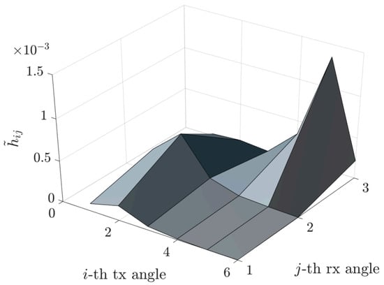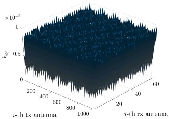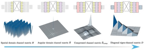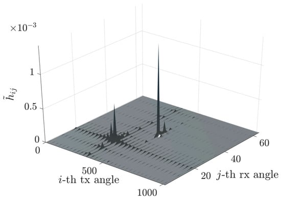 More precisely, Figure 6 depicts the channel matrix compression process in the spatial domain, mapping the transmit antenna elements to the receive antenna elements. Subsequently, an FFT block (or an inverse FFT block at the receiver side) is applied, enabling representation of the channel in the spectral (or angular) domain. The corresponding spectral-domain matrix, denoted as , exhibits significant sparsity, as illustrated in Figure 3. Following this transformation, the most relevant columns at the transmitter and the most relevant rows at the receiver are selected, significantly reducing the matrix dimensions and the computational complexity. This process yields a highly compressed matrix, , in the compressed domain. Subsequently, conventional MIMO techniques, such as SVD, can decompose the channel into eigenchannels, facilitating optimal transmission strategies based on individual channel gains and noise levels.