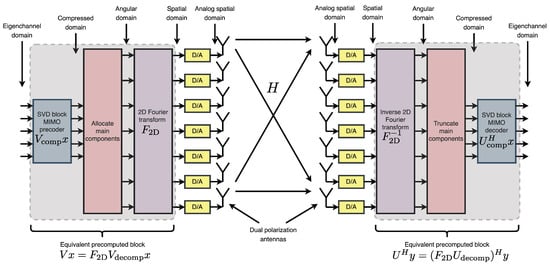 A key observation can be made: the initial three processing blocks at the transmitter and the final three blocks at the receiver consist of linear operations. As a result, it is feasible to precompute an equivalent transmission block and an equivalent reception block. This precomputation enables the direct execution of matrix–vector multiplication, eliminating the need for repeated FFT operations and substantially accelerating the transmission process. Consequently, although the FFT plays a critical role during the channel estimation and compression stages, precomputing the complete precoding and decoding blocks facilitates a significantly faster and more efficient communication scheme once these processes are completed.