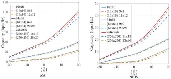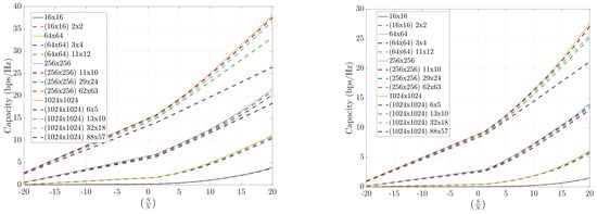 Capacity estimation for FFT-compressed channel in outdoor scenarios at 12 GHz (left) and 30 GHz (right). Symmetric arrays ().