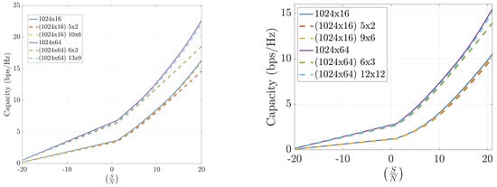 Capacity estimation for FFT-compressed channel in outdoor scenarios at 12 GHz (left) and 30 GHz (right). Asymmetric arrays ().