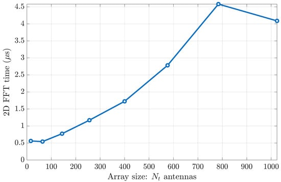 We evaluated the CPU time for a single 2D FFT on a standard laptop. Figure 11 presents these measurements (in microseconds) for array sizes . The total number of antennas in the transmitter is .