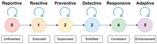 | Based on system responsiveness and detection accuracy | 0: No response capability 1: A delayed manual response (>72 h) 2: Manual monitoring, reactive response 3: Semi-automated alerts and mitigation 4: Full incident response plan with automation 5: Automated detection and active defense with <2% false positives |