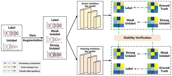 Based on the concept of stable samples, a dynamic stability assessment module using the strong–weak augmentation strategy is defined as follows: If a signal sample is stable for the model, the model’s predictions for the strongly and weakly augmented versions of the signal should be consistent. Additionally, the predicted label probabilities for the augmented samples should be high. The specific mathematical formulation is as follows: