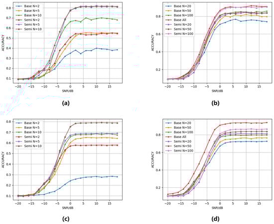 The model’s accuracy under varying signal-to-noise ratios (SNRs) and different numbers of labeled samples: (a) RML2016.10A, N = 2, 5, 10. (b) RML2016.10A, N = 20, 50, 100, all. (c) RML2016.10B, N = 2, 5, 10. (d) RML2016.10B, N = 20, 50, 100, all. The notation “base” indicates the model trained without semi-supervised learning, while “semi” denotes the model trained with semi-supervised learning, and “all” represents fully supervised learning.