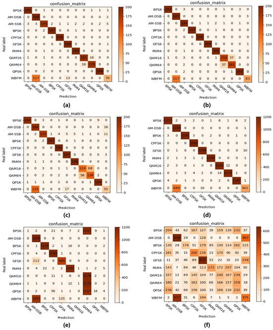 Recognition confusion matrices at SNR = 4 dB: (a) RML2016.10A, N = all, (b) RML2016.10A, N = 100 (semi), (c) RML2016.10A, N = 100 (base), (d) RML2016.10B, N = all, (e) RML2016.10B, N = 100 (semi), (f) RML2016.10B, N = 100 (base). The notation “base” indicates the model trained without semi-supervised learning, while “semi” denotes the model trained with semi-supervised learning, and “all” represents fully supervised learning.