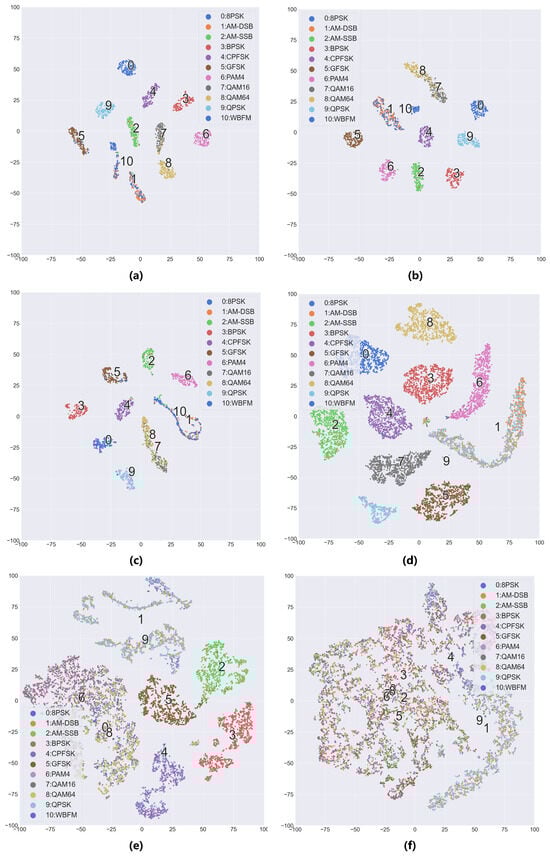 TSNE feature visualization chart when the SNR is 4 dB: (a) RML2016.10A, N = all, (b) RML2016.10A, N = 100 (semi), (c) RML2016.10A, N = 100 (base), (d) RML2016.10B, N = all, (e) RML2016.10B, N = 100 (semi), (f) RML2016.10B, N = 100 (base). The notation “base” indicates the model trained without semi-supervised learning, while “semi” denotes the model trained with semi-supervised learning, and “all” represents fully supervised learning.