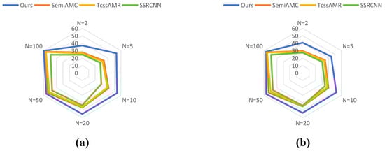 Experiments on the RML2016.10B dataset further confirm the proposed method’s generalization capability and cross-domain adaptability. As Figure 5 and Figure 6, our approach demonstrates systematic superiority across all annotation scales, with performance gains following interpretable patterns consistent with the RML2016.10A findings. Specifically, at N = 2, our method achieves 40.78% accuracy, substantially leading baseline models (SemiAMC: 29.62%, TcssAMR: 28.53%, SSRCNN: 27.41%), which underscores its profound exploitation of limited supervisory signals. When increasing to N = 10 labeled samples, the method reaches 52.17% accuracy, establishing a 12.23% absolute advantage over the suboptimal SemiAMC (39.94%). Even at N = 100, the method preserves a 1.4% performance lead. Cross-dataset analysis proves the method’s universal advantages under limited supervision, offering novel technical solutions to the fundamental trade-off between annotation resources and model performance in practical applications.