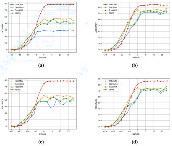 Accuracy of various semi-supervised methods under different SNRs and varying numbers of labeled samples on RML2016.10A and RML2016.10B datasets: (a) RML2016.10A, N = 10, (b) RML2016.10A, N = 50, (c) RML2016.10B, N = 10, (d) RML2016.10B, N = 50.