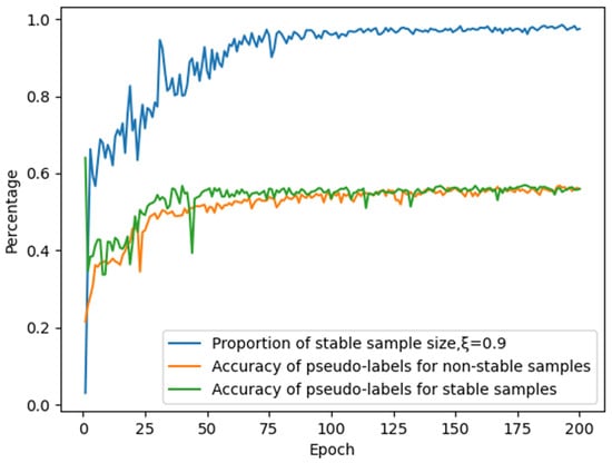 For the RML2016.10A dataset, we trained our model using only 10% of the unlabeled data with parameter set to 0.9. As shown in Figure 7, the incorporation of our proposed dynamic stability evaluation module based on strong–weak augmentation strategies significantly improves the accuracy of generated pseudo-labels. However, the results reveal that during initial training stages, while pseudo-label accuracy remains high, the number of samples satisfying stability criteria is limited, resulting in substantial underutilization of available unlabeled data samples.