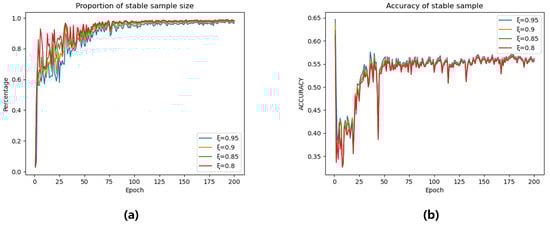 The impact of parameter ξ on (a) the number of stable samples and (b) pseudo-label accuracy of stable samples across training epochs.