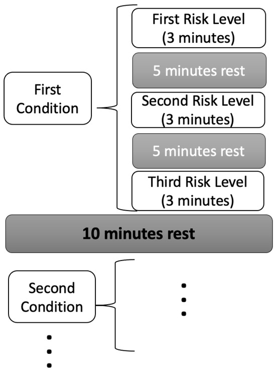 Each participant completed a total of ten lifting tasks, with each task lasting three minutes, during which participants aimed to perform twelve lifts. To prevent excessive fatigue, participants were permitted to stop prematurely if necessary. Rest periods of at least five minutes were provided between tasks within the same condition, while intervals of at least ten minutes separated tasks across different conditions, with additional rest allowed upon request. Comprehensive details regarding experimental conditions, tasks, and associated risks are summarized in Table 2. Additionally, Figure 1 illustrates the sequence and structure of the lifting tasks, offering a clear overview of the experimental task patterns. Load weights were randomly allocated within the appropriate LI range for each participant and task order was randomized.