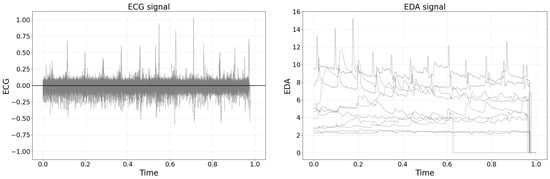 Raw bio-signal data were obtained using the OpenSignals platform and subsequently saved as text files. As shown in Figure 2, the raw EDA and ECG signals were plotted by randomly sampling 10 recordings from the total 222 datasets. For the analysis, raw data were intentionally selected over pre-processed features, a decision motivated by prior research [5] highlighting potential uncertainties and errors introduced by manual feature engineering. Moreover, the extraction of numerous features from a single bio-signal can result in high inter-variable correlations, complicating interpretability and potentially diminishing classification performance. Therefore, utilizing raw bio-signal data was deemed more advantageous for ensuring analytical robustness.