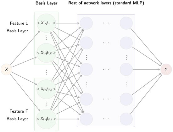 The adaptive basis layer assigns K learnable micro-networks to each input feature trajectory, generating inner-product coefficients. Each BL is implemented through multiple compact neural networks, termed micro-networks [11]. Specifically, for each input feature , a dedicated basis layer comprising K micro-networks is constructed. Each micro-network receives a time value t as input and produces a scalar output . Evaluating these micro-networks across all sample points yields K basis functions for each feature. Each micro-network is a two-layer perceptron with hyperbolic tangent (tanh) activations to ensure smooth and bounded outputs, followed by a linear output layer allowing basis values to assume both positive and negative values. For an input curve , the corresponding micro-network coefficient is calculated as