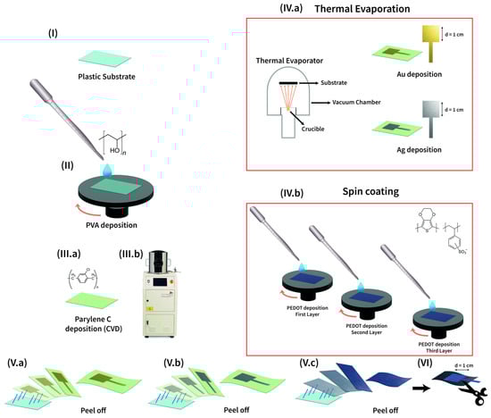 The Parylene C-based tattoo electrode fabrication process (I). The plastic carrier onto which (II) the PVA water solution was spin-coated. The Parylene C film was deposited through CVD (III.a,b). Gold and Silver electrodes were deposited via thermal evaporation using a shadow mask (IV.a), while PEDOT:PSS electrodes were solution processed (IV.b). Finally, electrodes were peeled off of the plastic carrier ((V.a) Au, (V.b) Ag, (V.c) PEDOT:PSS), and, additionally, PEDOT:PSS electrodes were cut to match the electrode dimensions (VI).
